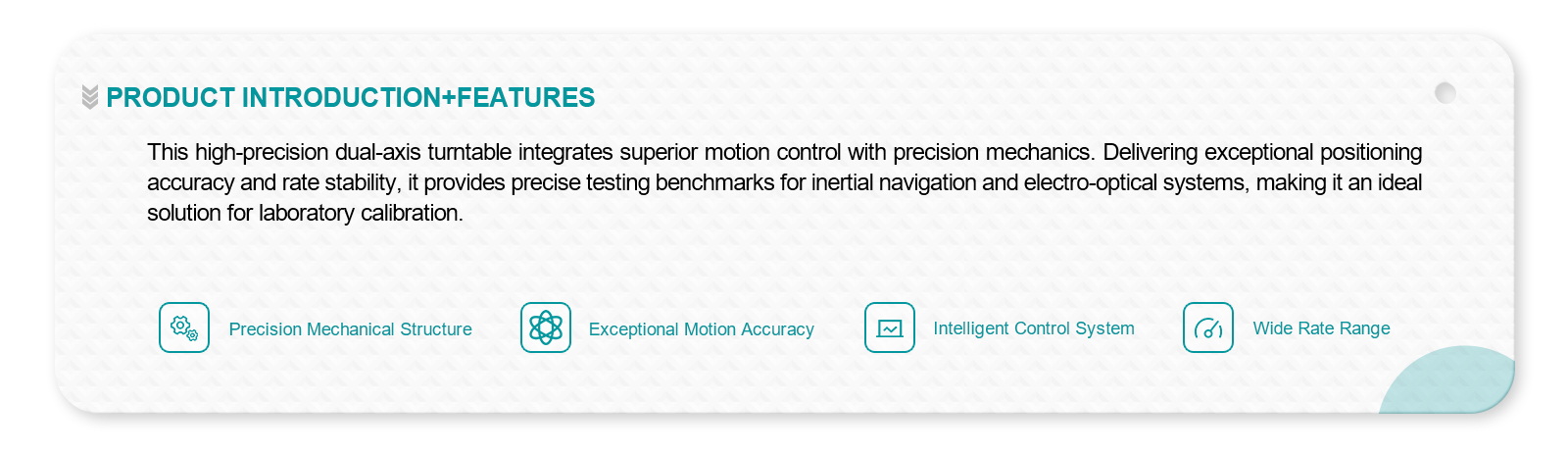 Dual-axis test turntable with high-precision motion control, designed to help laboratory researchers and R&D engineers solve the pain points of low positioning accuracy, inflexible motion range, and unstable long-term testing. This high precision dual-axis test turntable achieves sub-arcsecond control errors in dual-axis motion, reduces test time by 40% compared to traditional equipment, and ensures 99.8% consistency of output signals during long-term operation. Equipped with a U-T structure and 360° continuous rotation, it adapts to diverse test path planning, while the intelligent control system simplifies parameter setting and data monitoring. Trusted by universities and research institutions, click to learn how it optimizes your inertial sensor calibration and dynamic performance verification workflow.