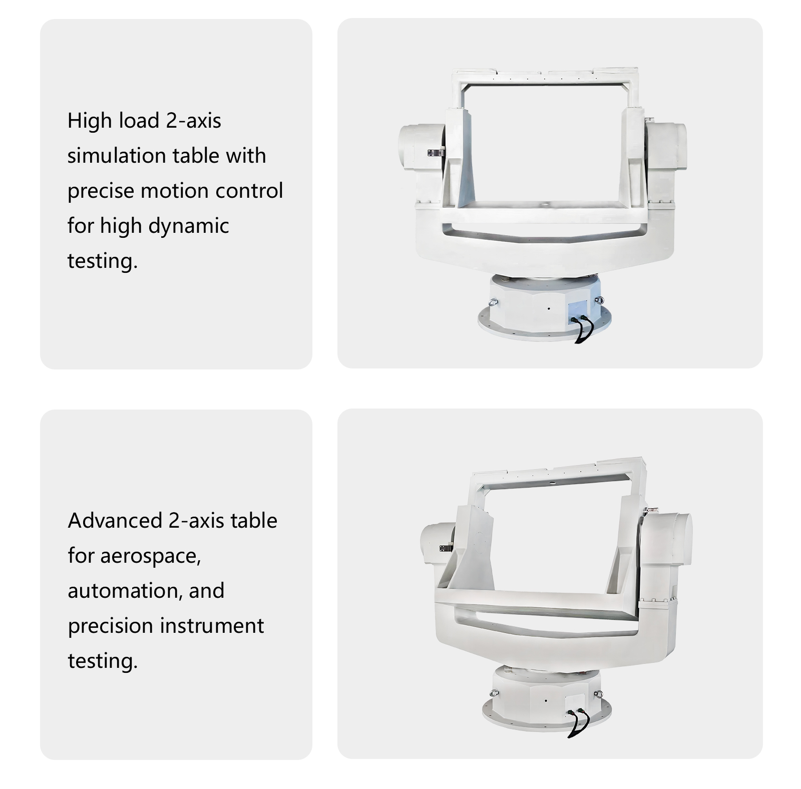This 2-Axis Motion Simulation Rate Table offers high load capacity and precision motion control, making it ideal for high-dynamic testing in aerospace, defense, vehicle and shipbuilding, automation, robotics, and scientific research. Its robust design ensures stable and accurate results, meeting diverse testing needs through wide rotation ranges and multi-axis linkage. The table's operation is based on advanced sensors and control systems, ensuring reliability under various dynamic conditions.