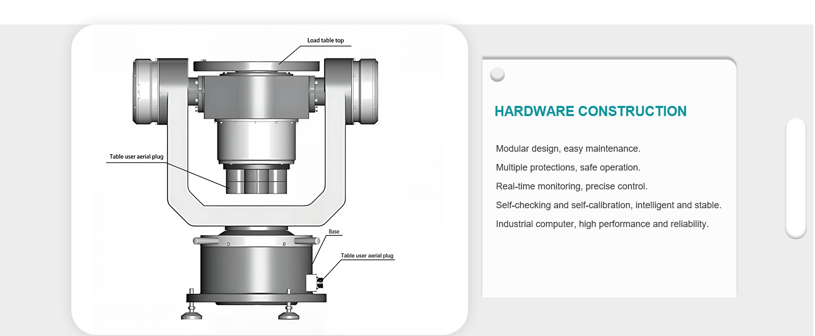 | Slip Ring | Total 30 channels: • 14 single-core, rated current 3 A • 16 twisted-pair shielded lines, rated current 2 A |