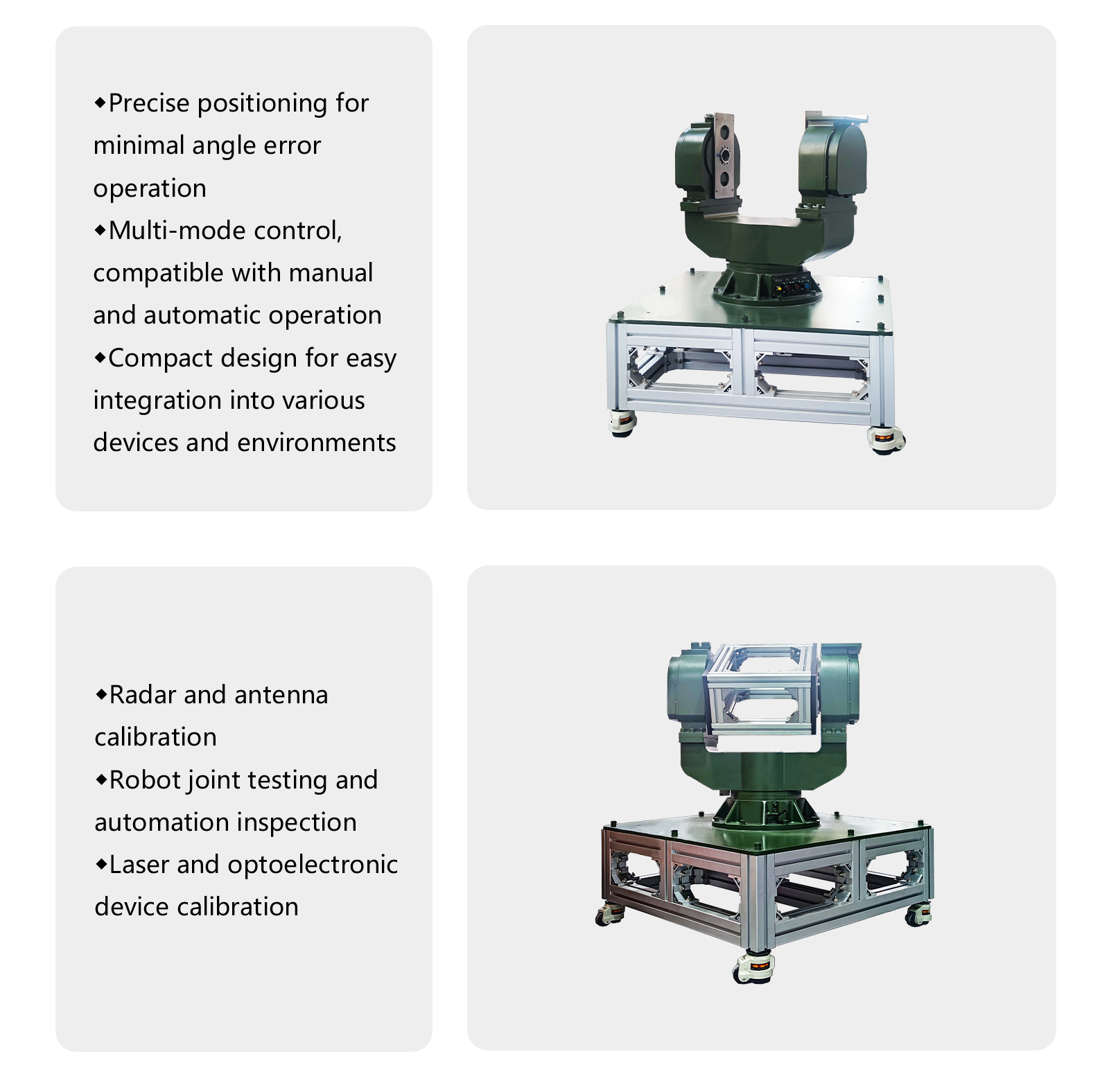 Our high-performance Two-Axis Motion Simulation Table is extensively used in the aerospace sector, specifically designed for testing and calibrating navigation devices, gyroscopes, and inertial measurement units (IMUs). It effectively simulates and tests satellite attitude control systems, as well as the precise calibration of radar and antennas to ensure optimal signal transmission. Additionally, this table is suitable for testing weapon aiming systems and missile guidance, ensuring precise target strikes. With its high-precision angle control, it excels in the calibration of optical lasers, photoelectric devices, and astronomical telescopes. Its operation relies on high-performance servo motors, precise gear reducers, and a closed-loop control system to ensure real-time adjustments and feedback, achieving high standards of measurement accuracy.