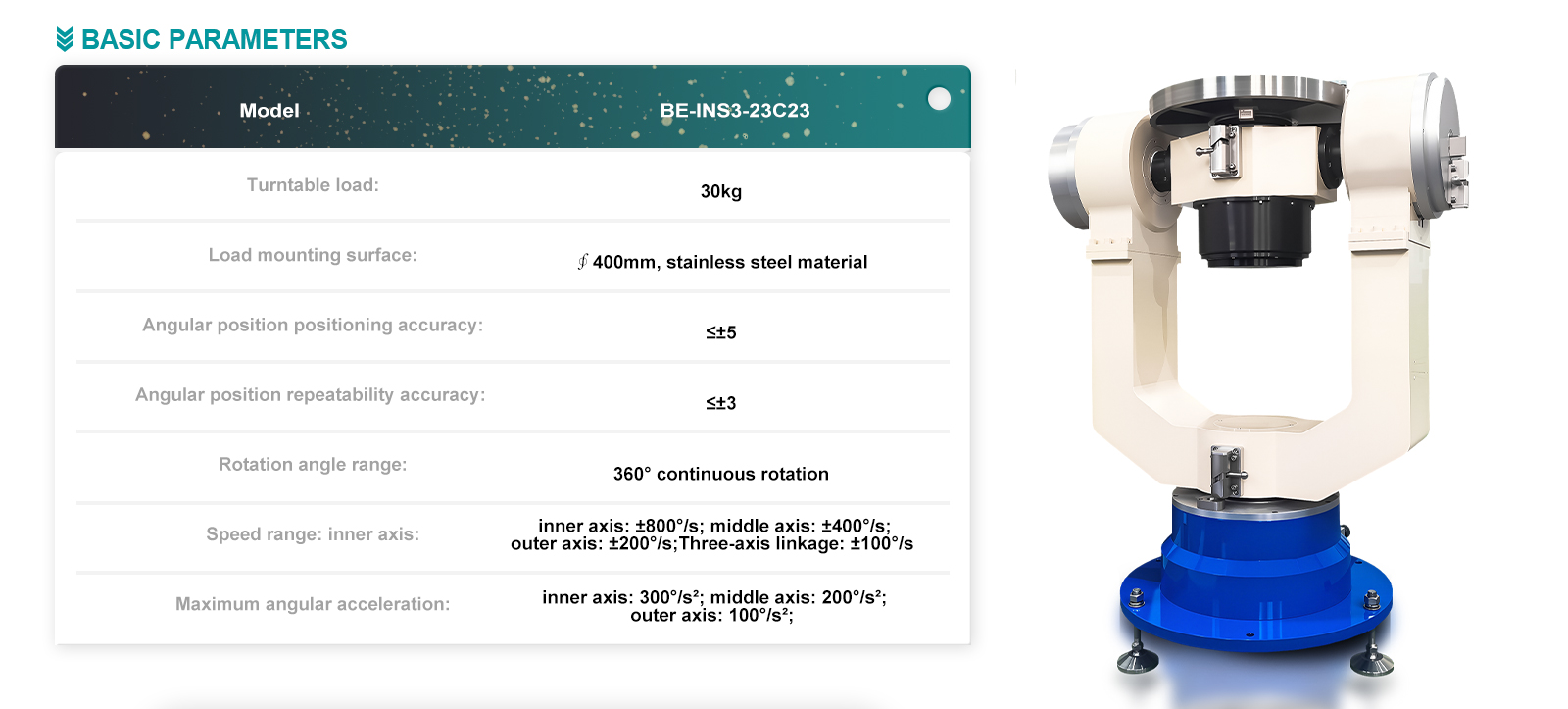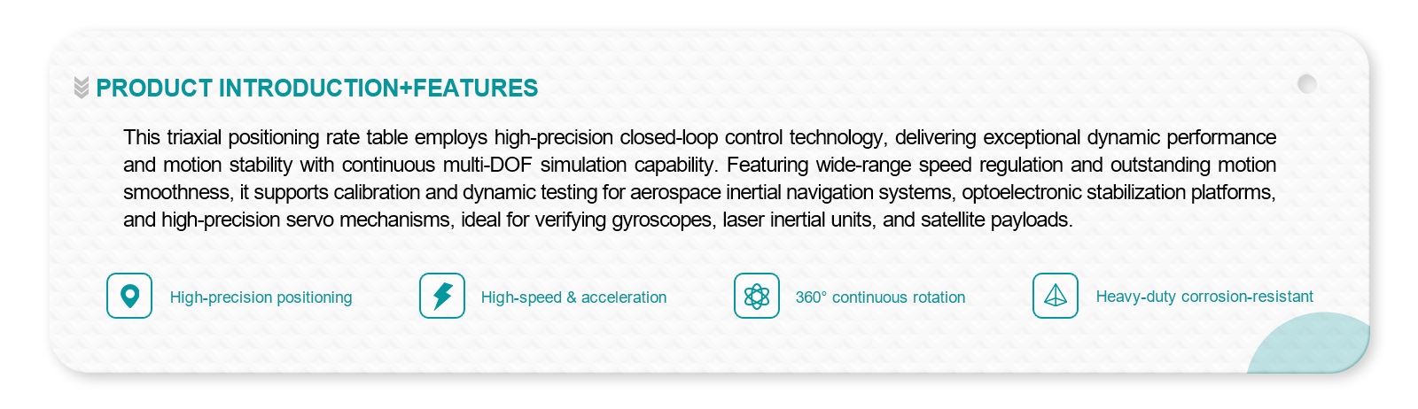 | 8 | Rate Range | Inner frame: ±0.001°/s ~ ±800°/s Middle frame: ±0.001°/s ~ ±400°/s Outer frame: ±0.001°/s ~ ±200°/s Three-axis linkage: ±100°/s |