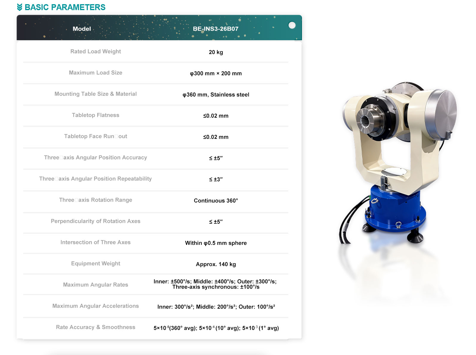 | Angular positioning repeatability (three axes) | ≤ ±3 arcsec (″) |