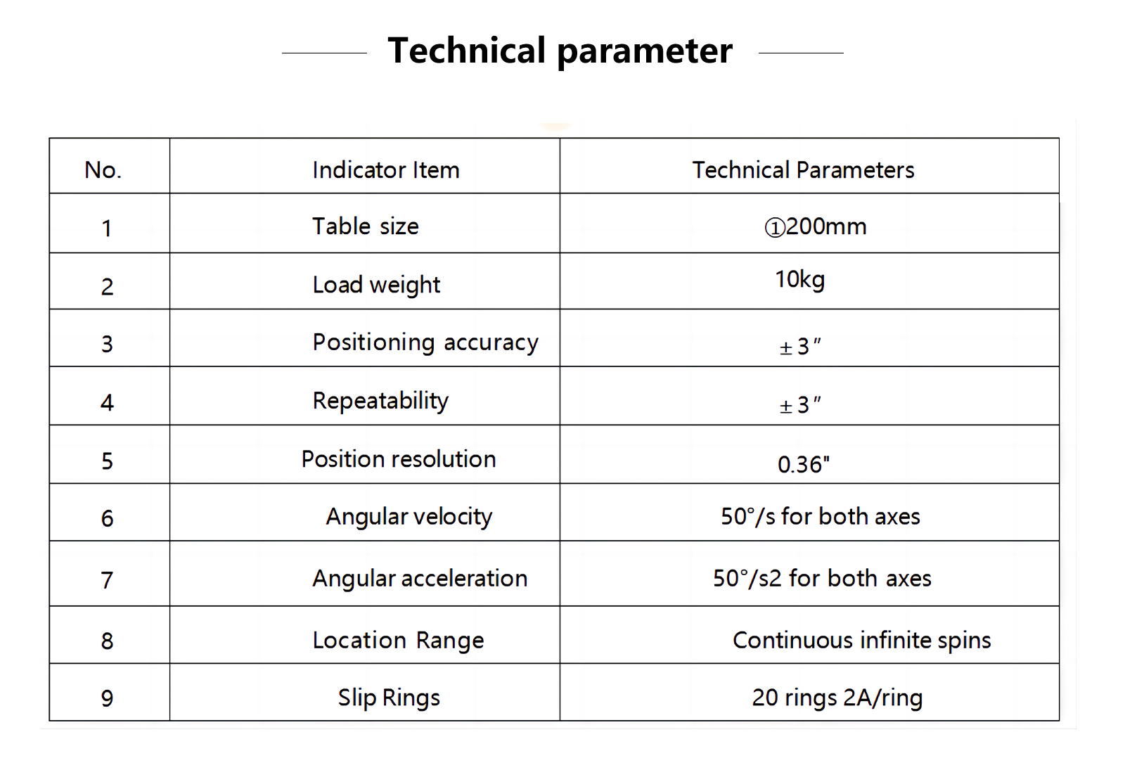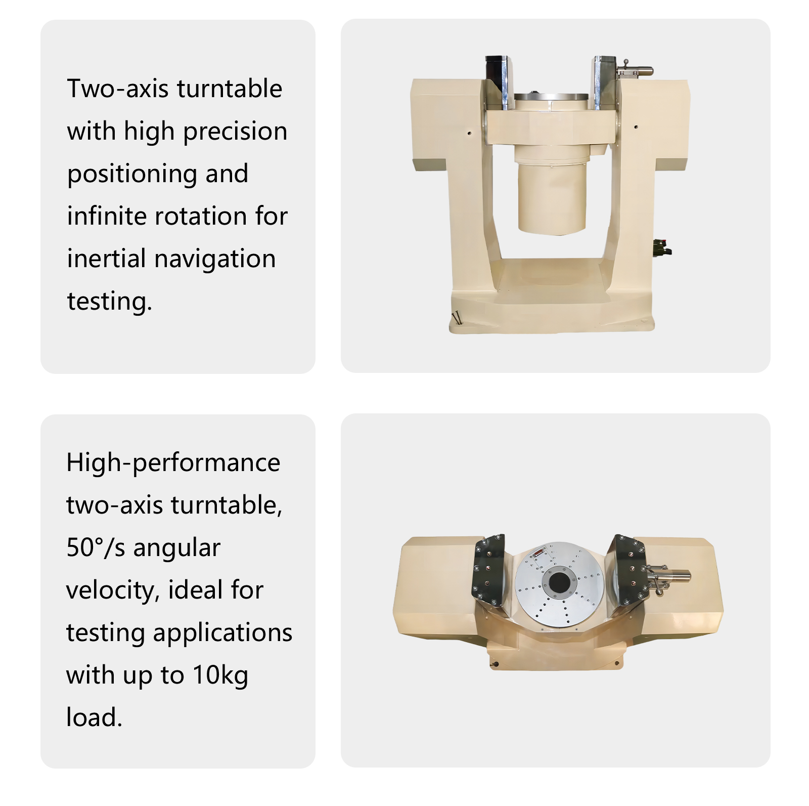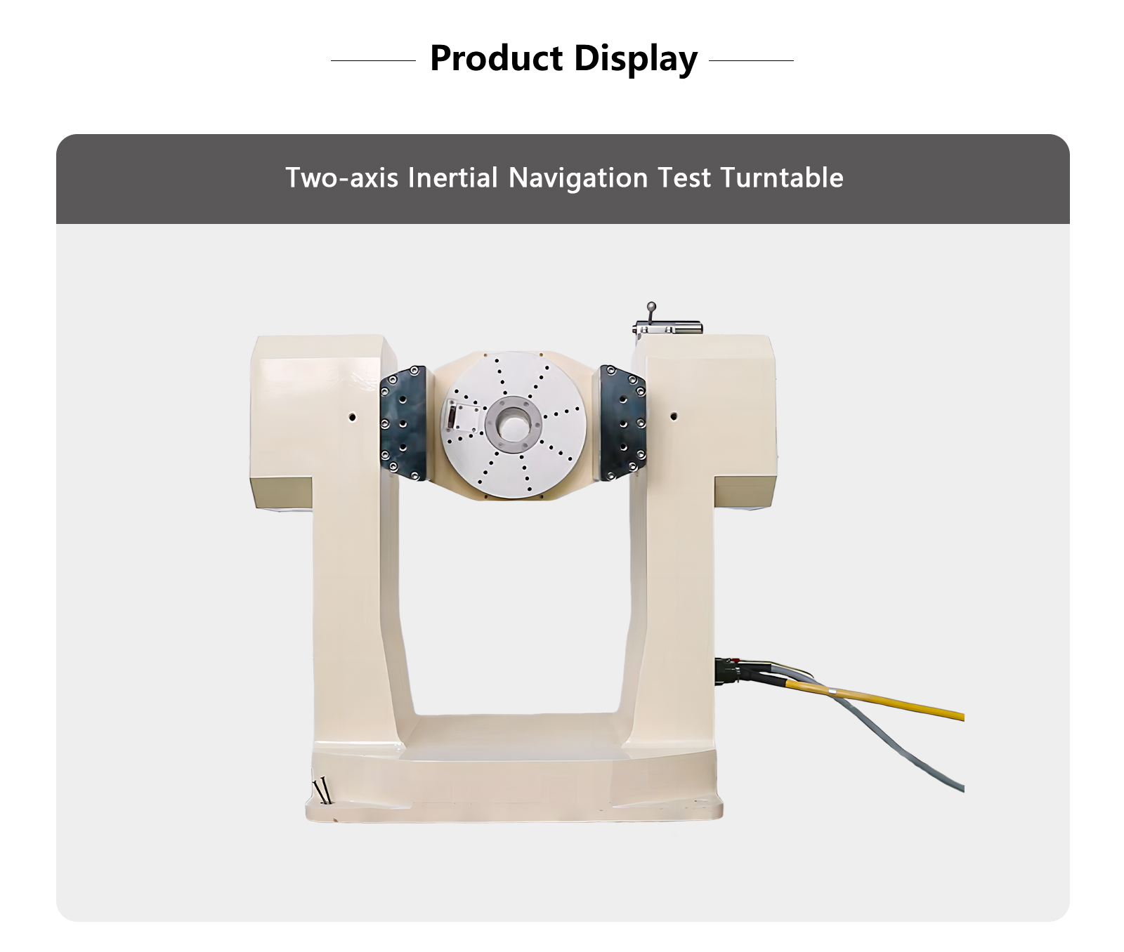 The Two-axis Inertial Navigation Test Turntable is engineered to meet high-precision testing requirements, ideal for various industrial and electronic testing applications. This turntable boasts excellent positioning accuracy and repeatability, enabling continuous infinite spins. Equipped with multiple slip rings, it supports complex electrical connections, ensuring stable and efficient operation. The Two-axis Inertial Navigation Test Turntable is the perfect choice for inertial navigation system testing, suitable for a wide range of precision testing scenarios.
