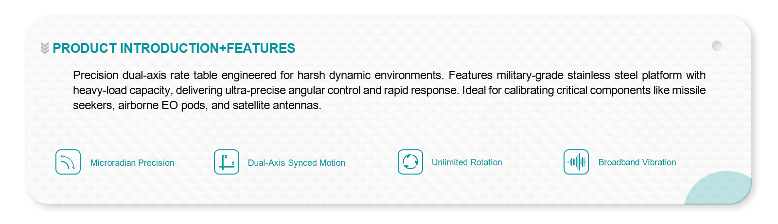 Dual axis rate table designed for inertial navigation testing helps engineers and labs solve accuracy drift and repeatability issues in velocity and position evaluation. This 580mm dual axis rate table integrates position, velocity, and swing control on a durable stainless steel platform, supporting up to 50kg load capacity for stable sensor calibration. With serial and parallel interfaces, remote operation can reduce test setup time by up to 30%, improving overall efficiency. Trusted for precision testing environments