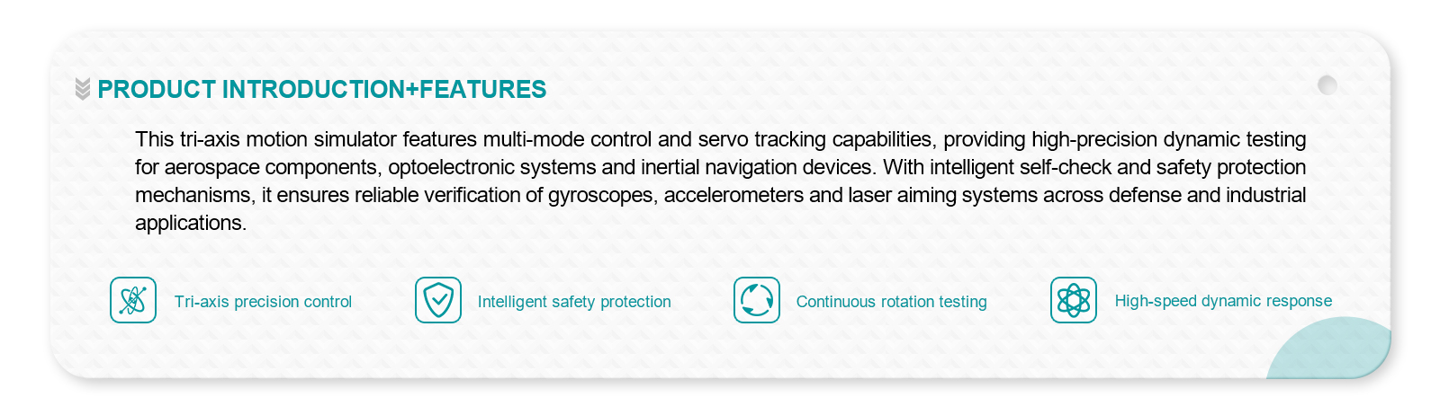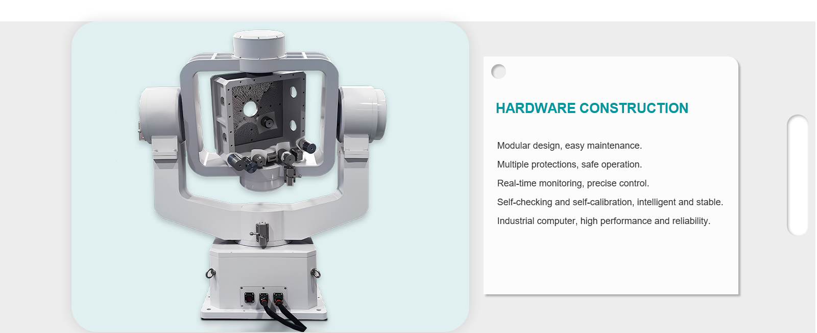 | Function: | With inner, middle and outer three-axis angular position, angular rate control and servo tracking functions; With self-test function; With protection function to ensure the safety of people and equipment during high-speed rotation; |
